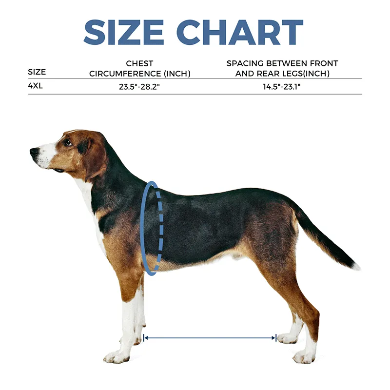 To determine the best size for your pet, please measure your dog in a natural standing position and measure from 1” above the right stifle (knee) to the middle of the back. If in-between sizes, please select the size based on your dog’s weight range.